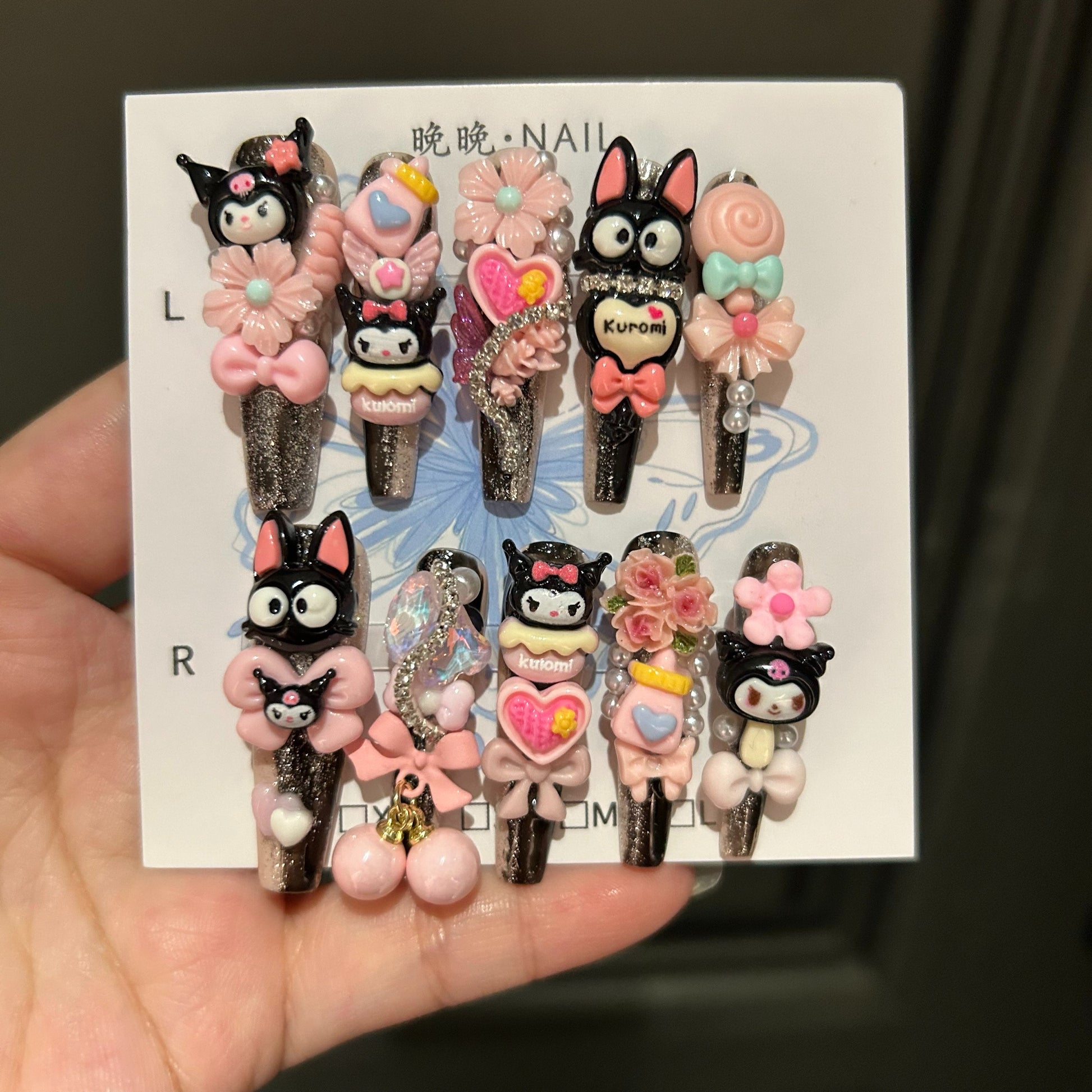 Cute and edgy Kuromi-themed press-on nails, handcrafted with care. Perfect for fans who love unique, high-quality nail art with a touch of rebellious charm.